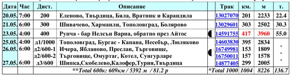 200, 300 и 400 км са без промяна от миналата година.