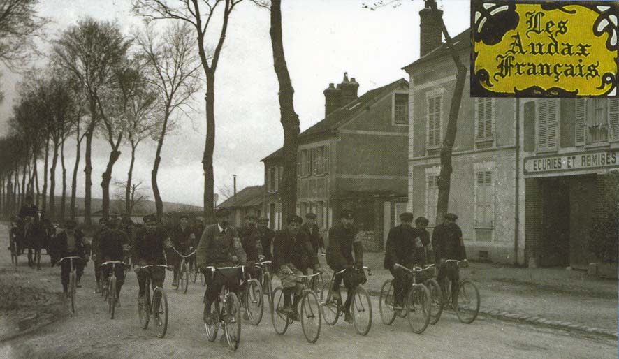 razkaz 06Снимка на първият официален пробег на 200 км през 1904 г. показва пелотона на връщане към Париж след обедна почивка в град Върнън. Шарл Стурм /третият основател на Audax Français, за когото стана дума в предишен разказ/, е колоездачът в центъра на снимката със светли панталони.