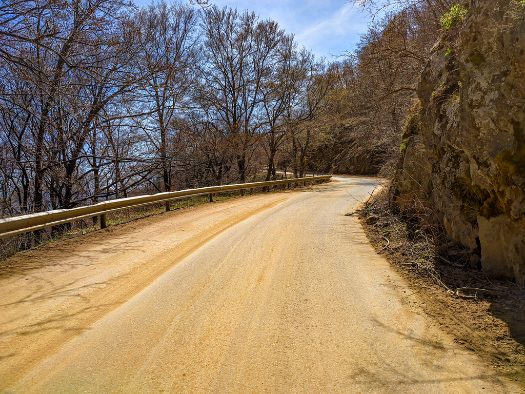 След зимата се отварят дупки в този участък, по завоите има доста пясък и чакъл а в долната част на прохода има дълги участъци с надрано на ивици асфалтово покритие и с по някоя друга дупка в сенките и по завоите ...