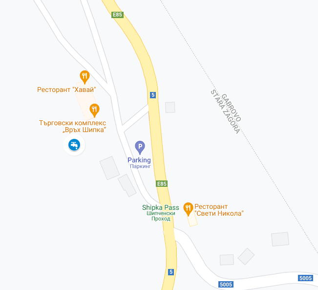 Горе на върха на прохода Шипка има паркинг с магазинче в ляво и ресторант  малко по-назад в дясно.