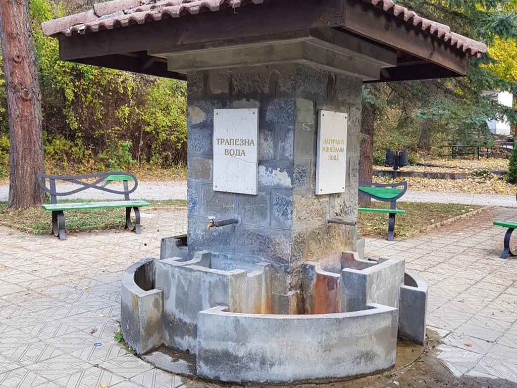 Тук има голяма чешма с четири чучура от всеки от които тече различен вид минерална вода.
