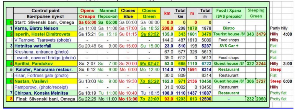 2. Контролни пунктове: Локации на контролите, времена на отваряне и затваряне, дистанция и положителна денивелация между две контроли и с натрупване,